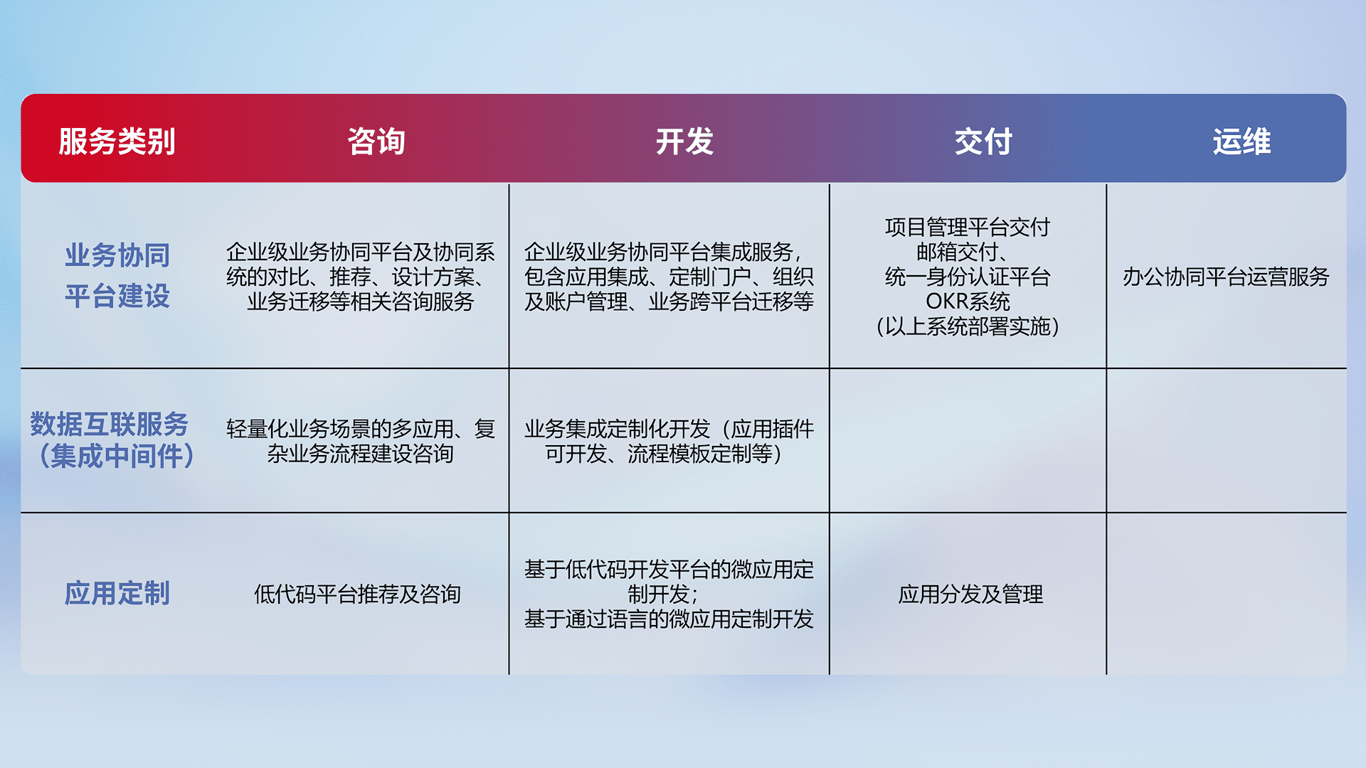 针对钉钉、、、企微、、IDaas等平台级产品提供产品的规划、、、、方案、、、、交付、、、、定制化开发等服务,,,实现如统一协同办公、、、、智能客户服务、、混合会议管理、、、、智能数据查询、、、、等业务场景,,,,实现数字化转型。。